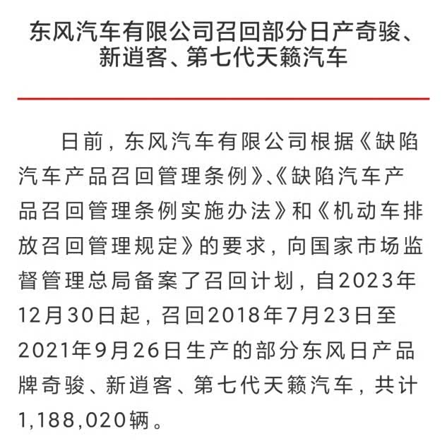 2023年12月,东风汽车有限公司向国家市场监督管理总局备案了一次大规模召回。因发动机废气再循环阀(EGR阀)密封不严,内部轴承可能被含氯冷凝水腐蚀,导致阀体卡滞、发动机运转不良、故障灯点亮,极端情况下可能出现低速熄火、动力中断等安全隐患。此次召回涉及奇骏、新逍客、第七代天籁共计1,188,020辆,逍客车主正是其中的主力军。