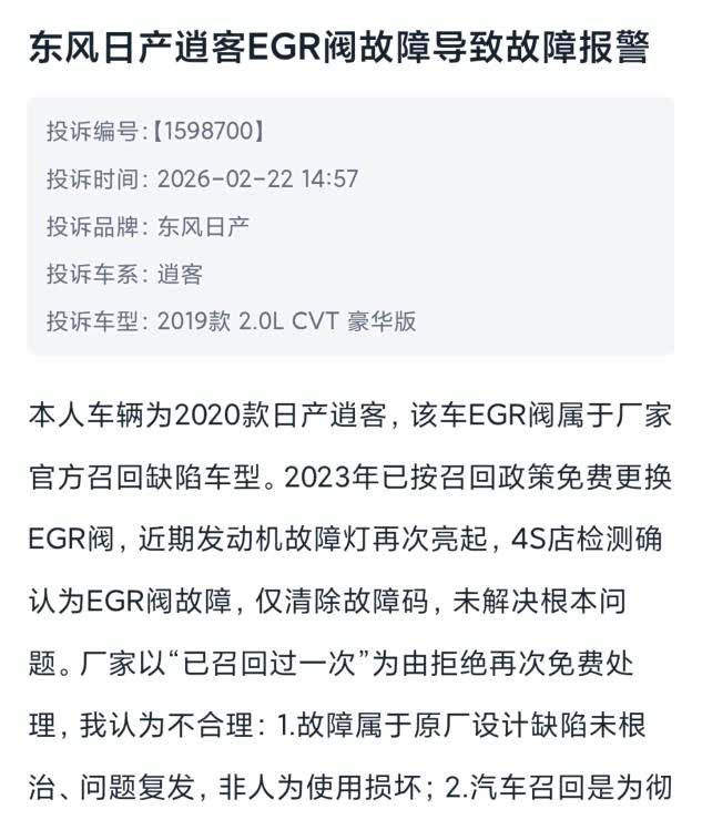 2026年2月,一位2020款逍客车主的投诉引起了关注。该车主于2023年按召回政策免费更换了EGR阀,然而近期发动机故障灯再次亮起,4S店检测确认——还是EGR阀故障。维修人员仅清除了故障码,未解决根本问题。当车主提出进一步维修要求时,厂家以“已召回过一次”为由,拒绝再次免费处理。