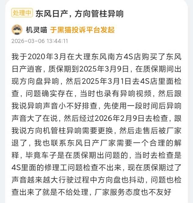 一位2019款逍客车主描述了自己的遭遇:质保期内车辆出现方向盘异响,2025年3月1日前往4S店检查,问题确实存在,也录制了异响视频。当时4S店的回复是“异响声音小不好排查,先使用一段时间,等异响声音大了再说”。车主听从建议,继续使用车辆。2026年2月9日再次检查时,4S店确认方向机管柱异响需更换,然而此时质保期已过,厂家以“过保”为由拒绝处理。