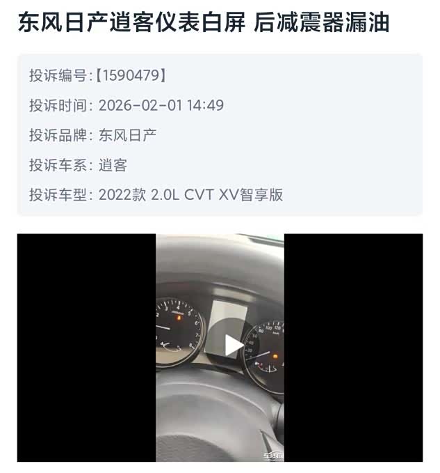 2026年2月,一位2022款逍客车主投诉称,车辆购买了厂家提供的“5年15万公里双保-整车质保服务”,且一直在4S店保养。2025年8月,4S店保养时反馈“两后减震漏油”,但未告知如何处理。2026年1月再次保养时,车主主动提出检查减震器,得到的回复却是“漏油达不到厂家的换件标准”。