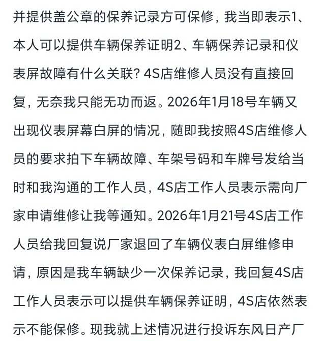同一车主还遭遇了仪表盘白屏问题。2026年1月15日车辆出现白屏,车主按要求拍摄故障视频后,4S店向厂家申请保修,却被退回——理由是“缺少一次保养记录”。
