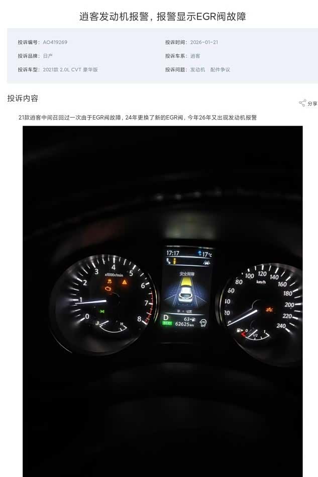 类似的遭遇并非孤例。2026年1月,一位2021款逍客车主也在投诉平台发声:2024年更换了新的EGR阀,2026年又出现发动机报警。