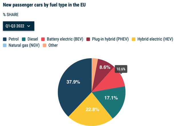 但即便中国产的电动车能全方位迎合欧洲用户的喜好,依然有一个客观存在的事实摆在面前,那就是欧洲的新能源车市占率并未如想象中的高——据ACEA统计,今年前三季度,BEV的市占率为10.6%,PHEV为8.6%,两者加起来还不如HEV(22.8%)多。