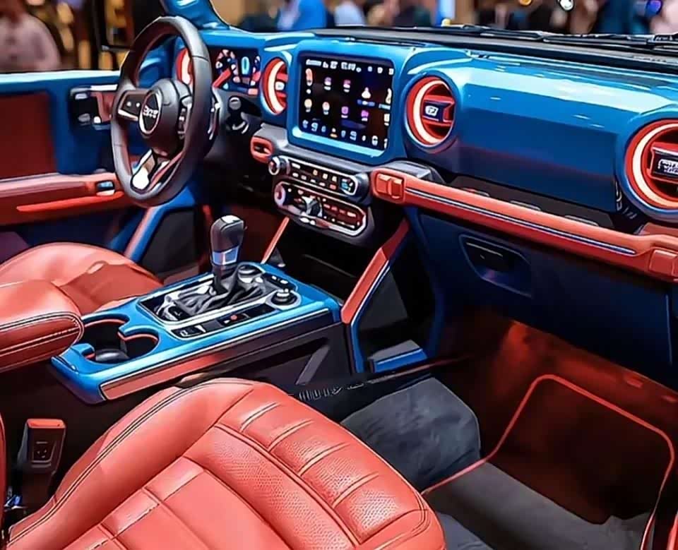 内饰,和以往硬派相比,新“牧马人”完成了蜕变,目前得知,新车将采用两个版本设计,分别是图中的这种分体式的屏幕以及连体式的屏幕。我们以图中的版本为例,升级到了液晶仪表,显示效果非常丰富,一改往日单调的设计风格,而中间则是内嵌式的多媒体屏!四只大尺寸的圆形空调出风口还增加了可点亮的设计,这是以往牧马人所不曾有过的设计。新车挡杆位置没有改变,包括整个座椅也是!