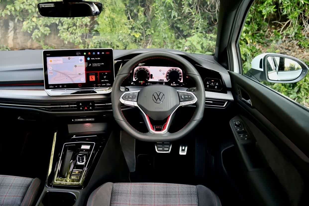 Mk8.5 GTI 的其他标准套件包括 19 英寸合金轮毂、带发光前大众徽章的 LED 外部照明、自适应减震器、三区自动气候控制、12.9 英寸触摸屏、无线智能手机镜像、卫星导航、10.2 英寸数字驾驶员显示屏、30 色座舱环境照明、带换挡拨片的厚实皮革方向盘以及 9 个安全气囊、AEB、自适应巡航和车道引导、带后方交叉交通警报的盲点监控和自适应远光灯等安全功能。