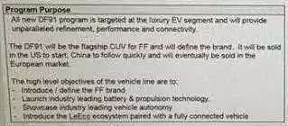 项目代号“DF91”将成为FF的旗舰,打造FF的品牌,目标市场以北美为先,中国随后,最终进军欧洲市场。