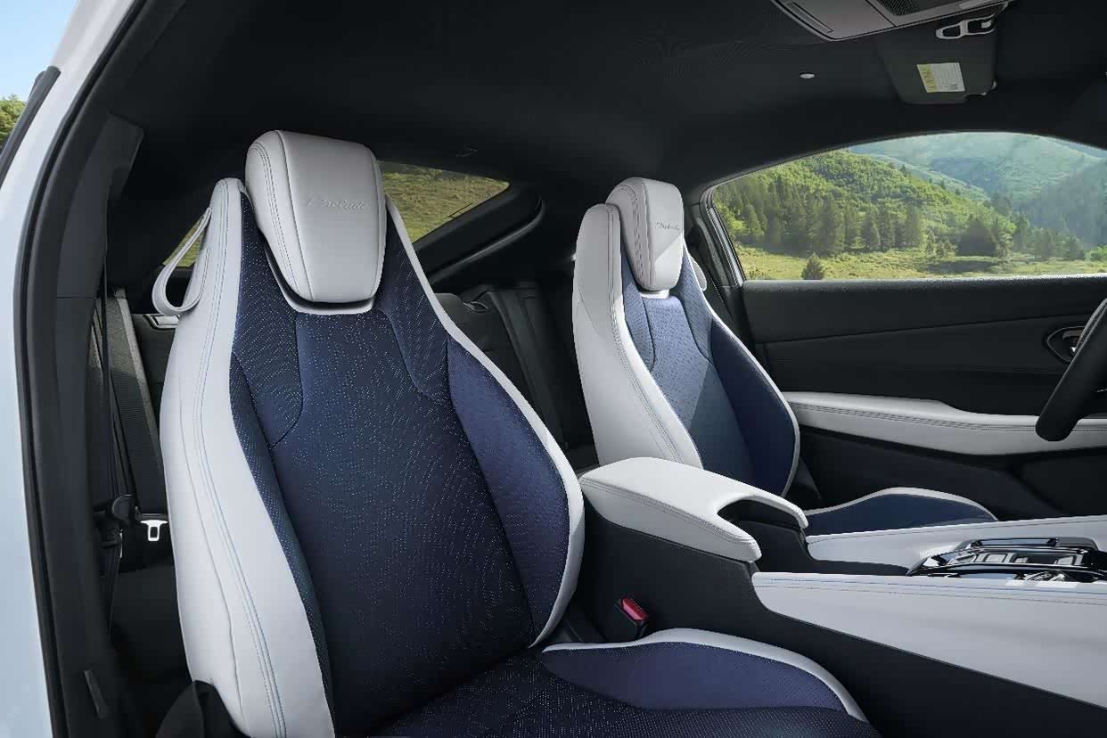至于 Prelude 的其余内饰,“高架思域”可能是一个恰当的描述。本田紧凑型轿车时尚的 HVAC 装饰通常与仪表板长度一致,现在被分成六边形,超细绒面革从 9 英寸信息娱乐屏幕底部一直延伸到乘客侧。刺绣的 Prelude 标志位于蓝色缝线上方远处通风口附近,无论如何,从图片上看,它确实比典型的思域座舱感觉更特别一些。有两种内饰配色 - 蓝/白或黑色 - 所有 Prelude 都为驾驶员座椅提供了特殊的支撑,其“衬垫坚固,大腿下部支撑比乘客座椅更突出”。