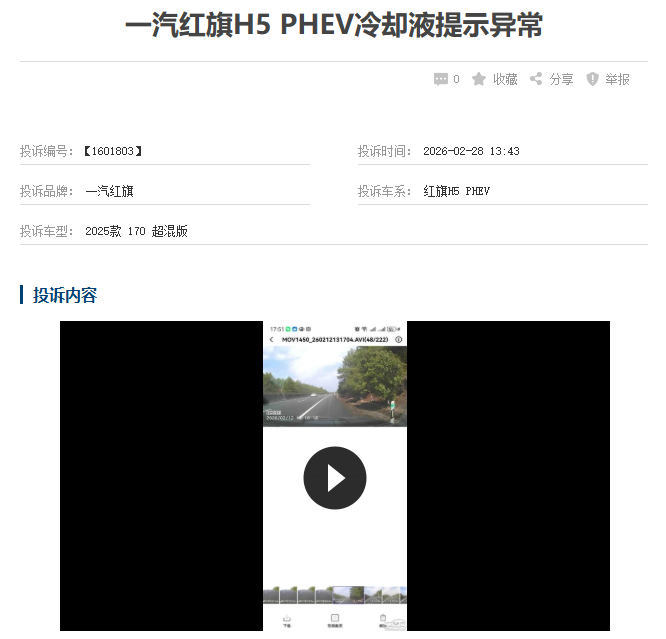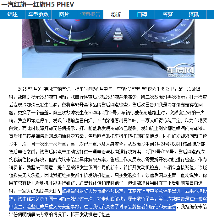 更值得关注的是涉及核心部件的案例。2026年2月底,一位2025款红旗H5 PHEV车主反映,2025年9月提车,到2026年2月,车辆总行驶里程六千多公里,却遭遇了三次冷却液故障。
