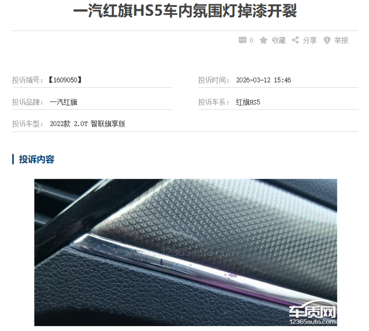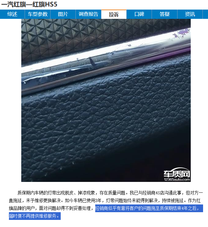 2026年3月12日,一位2022款 红旗HS5(参数|询价)的车主在某第三方汽车投诉平台上反映,自己车辆还在质保期内,车内用于营造氛围的灯带却出现了大面积脱皮和掉漆现象。当他将这一问题反馈给4S店后,对方并没有积极安排维修更换。车主在投诉中表示,经销商似乎有意将问题拖过4年的整车质保期。