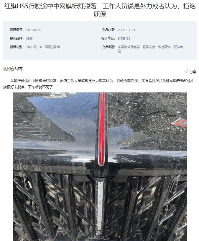 2026年1月,一位2025款红旗HS5的车主在正常行驶途中发现,车辆前脸中网最具标志性的“旗标灯”,竟在行驶过程中意外脱落。车主提供了监控截图,显示车辆在启动和行驶途中旗标灯完好无损,但下车后却已不见踪影。