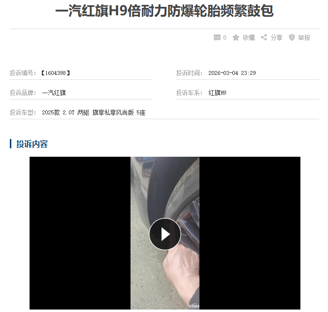 据这位车主了解,红旗H9配备的倍耐力防爆轮胎无故鼓包、开裂的投诉并非个例,而4S店仅凭两张照片就做出的鉴定结论,让他难以接受。
