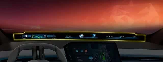 BMW视平线全景显示通过特制光学组件与矩阵式背光分区光源的协同优化,可实现从A柱到A柱的超宽视域投影画面。