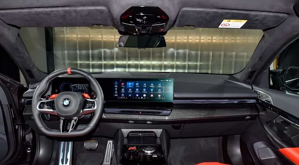 性能说完,我们再来看看宝马M5 PHEV在内饰方面的表现,在内饰设计上,宝马M5 PHEV不仅采用了大量的皮革材质和翻毛皮材质,同时在中控台上还有不少碳纤维的装饰件,再加上平底式的方向盘,让其车内的运动质感更加出色,而在显示屏幕方面,宝马M5 PHEV的中控屏幕采用了14.9英寸的触控屏,而全液晶仪表的尺寸为12.3英寸,在科技质感的表现上,宝马M5 PHEV也有着不俗的表现。