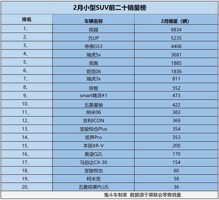 日前,乘联会发布2月零售销量数据,鬼哥整理出2月小型SUV销量排名前二十榜单,结果发现,2月份,小型SUV市场销量有点惨,没有一款小型SUV销量冲破万辆,而排名靠前的小型SUV车型中,燃油小型SUV颇多。接下来,看看具体车型排名与销量表现。
