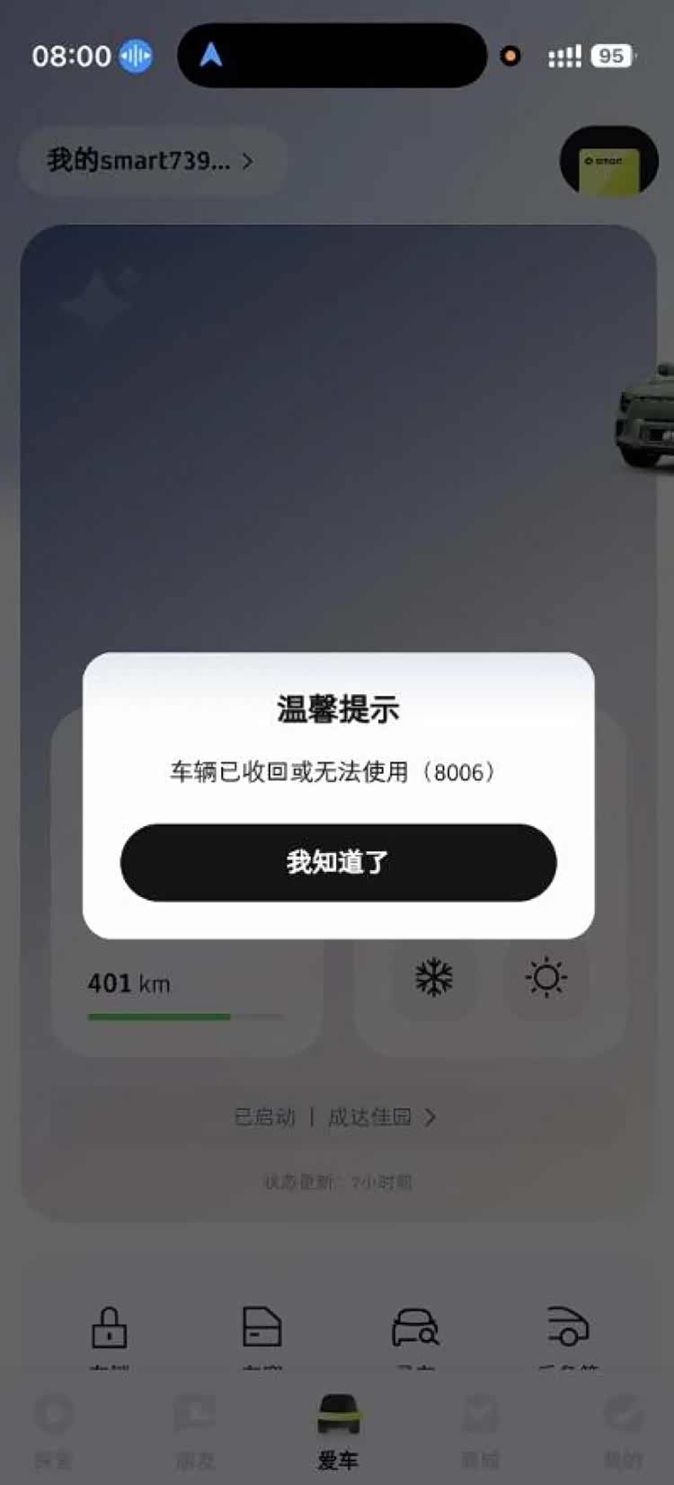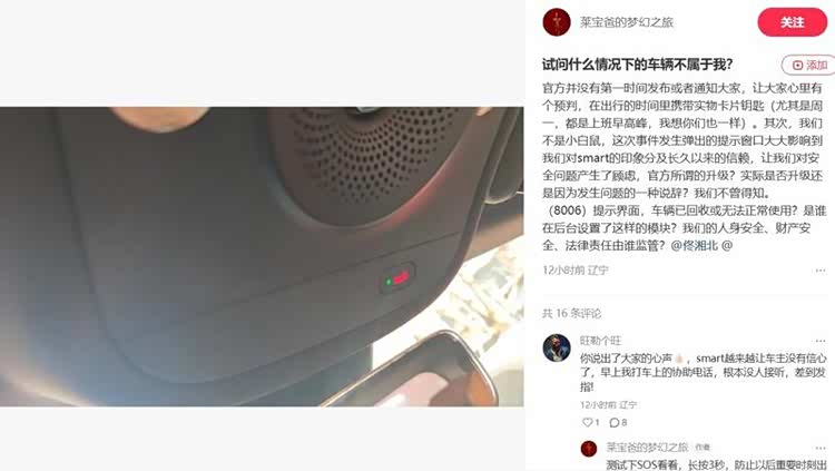 小李表示,他反复刷新APP、退出登录重新登录,甚至重启手机,都无法解决问题,APP界面始终只跳出“8006”“8060”等陌生错误代码,任何控车操作都无法完成。和小李有同样遭遇的车主不在少数,均反映自己遇到了相同的APP异常和控车失灵问题,有车主被困高速口、学校门口,还有车主因无法启动车辆,不得不临时请假、更换出行方式,抱怨声此起彼伏。