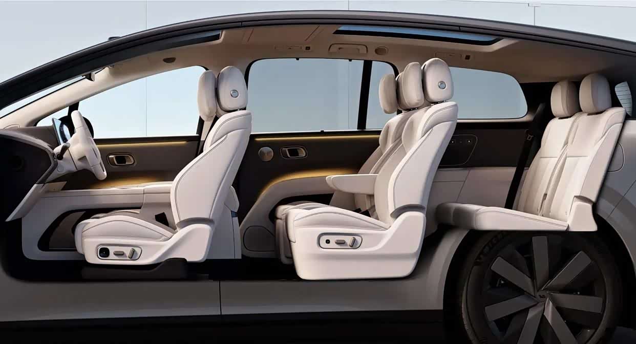 空间体验是家庭用户的核心关切。理想i8基于纯电平台优势,采用创新的“舒适平权”理念。纯平地板设计为第三排乘客带来了充裕的脚部空间,配合全新设计的环抱式座椅(尤其是二排右侧的零重力座椅带超大豪华腿托),确保每一排乘客都享有MPV级别的乘坐舒适度。车内静谧性同样堪称标杆:前风挡、侧窗及全景天幕均采用双层声学夹胶玻璃,配合前排四个精心设计的静音电动出风口,营造出图书馆级的静谧座舱。实用性同样出色:在满载六人的情况下,后备箱进深仍达565毫米,轻松容纳两个28寸超大行李箱外加四个背包,足以满足全家一周出行的物资需求。