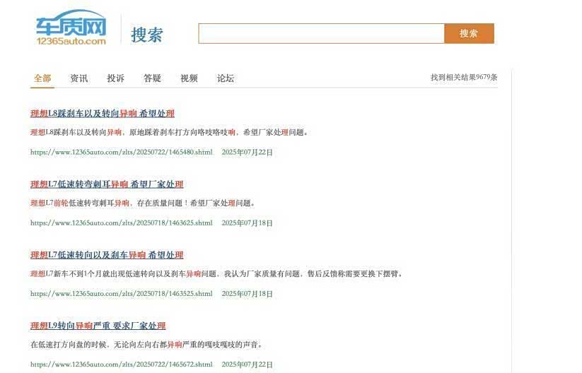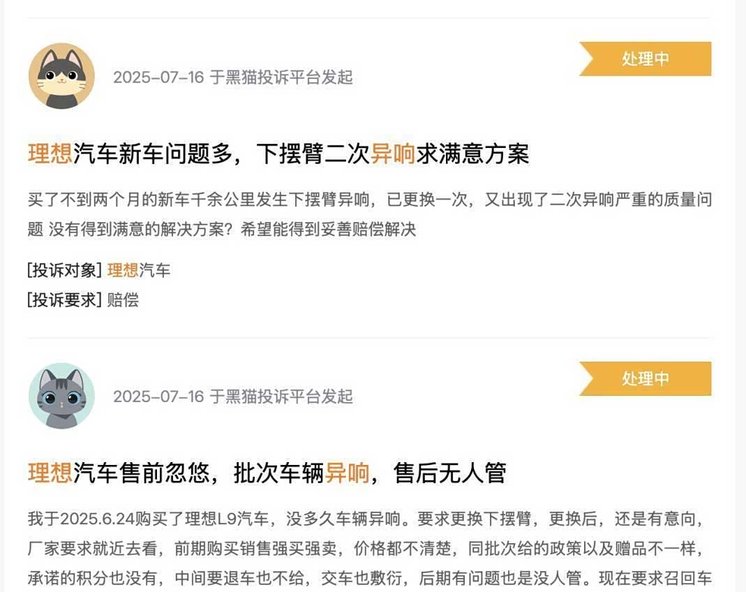 车质网和新浪黑猫投诉平台数据显示,7月以来针对理想L全系车型的“转向异响”“刹车异响”投诉激增。 一位黑猫投诉用户怒斥:“第一次换完下摆臂,安静了三天又响! 售后却说‘再换一次试试’,我们买的是车还是实验品? ”。