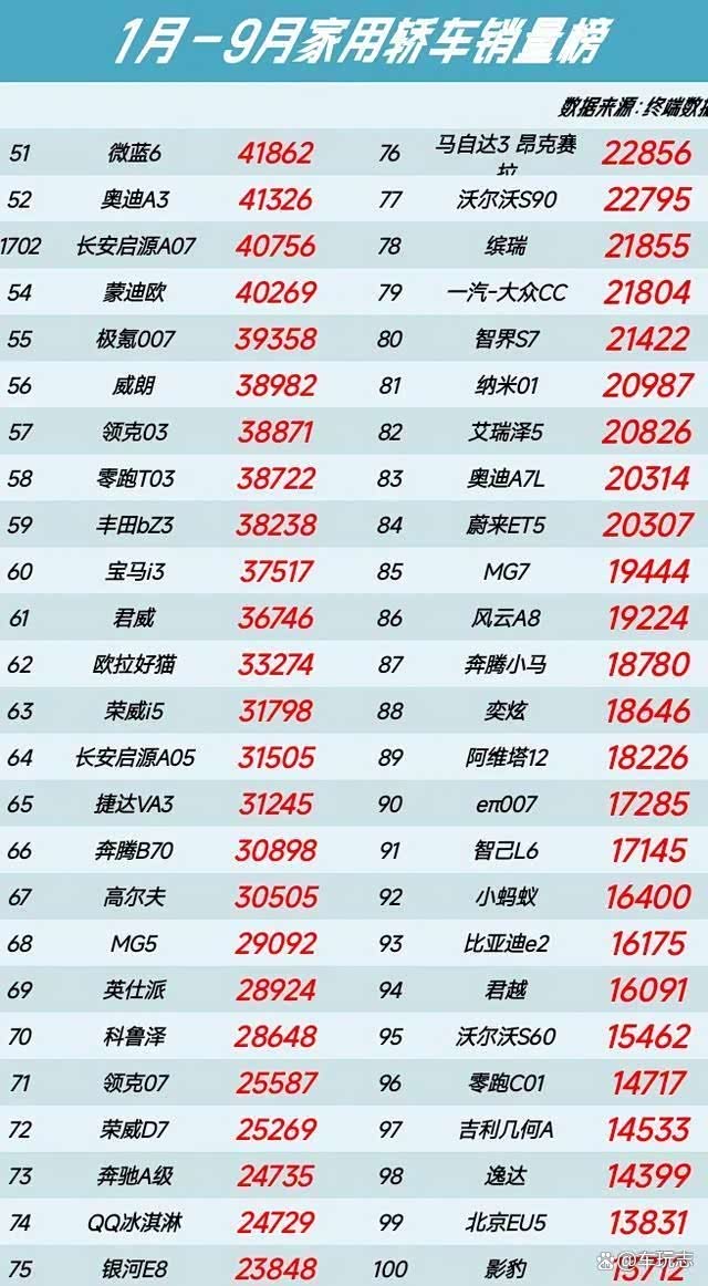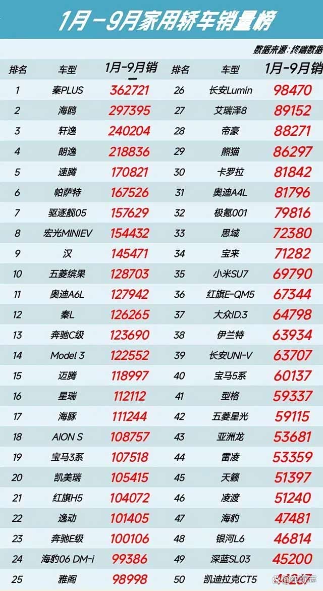 而Model 3、星瑞、海豚、销量在111244辆以上,排名也一举进入前20名以内。 之后来的长安Lumin、熊猫、奥迪A4L、销量在98470-71282之间。小米SU7、伊兰特、长安UNI-V、表现一般销量低于69790辆之下。而五菱星光、雷凌、凌渡、销量更是在59115辆。
