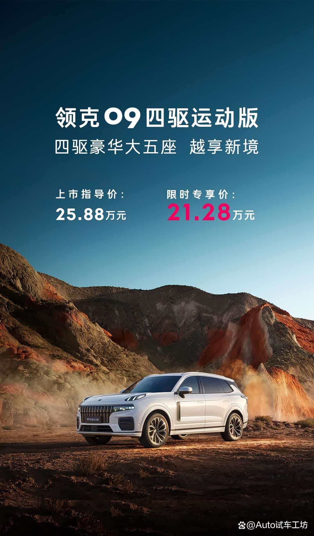 领克09五座版正式上市,指导价为25.88万元,目前官方推出限时专享价为21.28万元。此前,