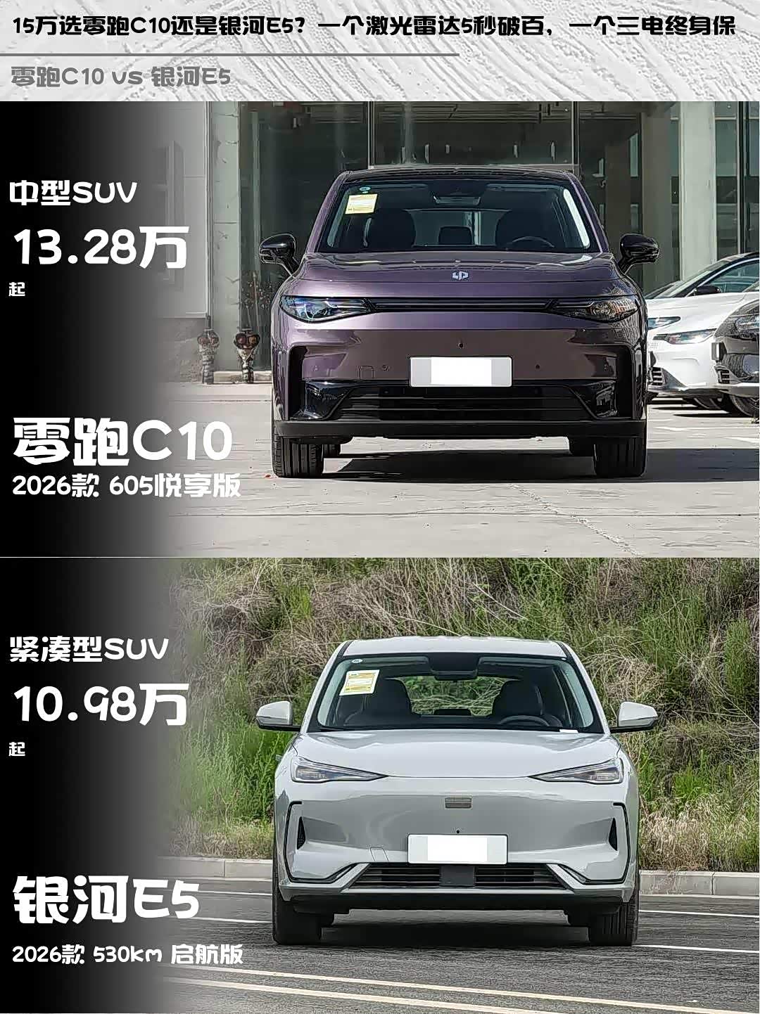 要智能科技和驾驶质感选零跑C10,605km续航长途更从容;图经济实惠和家用便捷就选银河E5,三电终身质保+六年整车保修更省心。我个人最终选了零跑,毕竟13万出头能给到激光雷达和5秒级加速,这性价比真的没话说!你们觉得哪款更香?