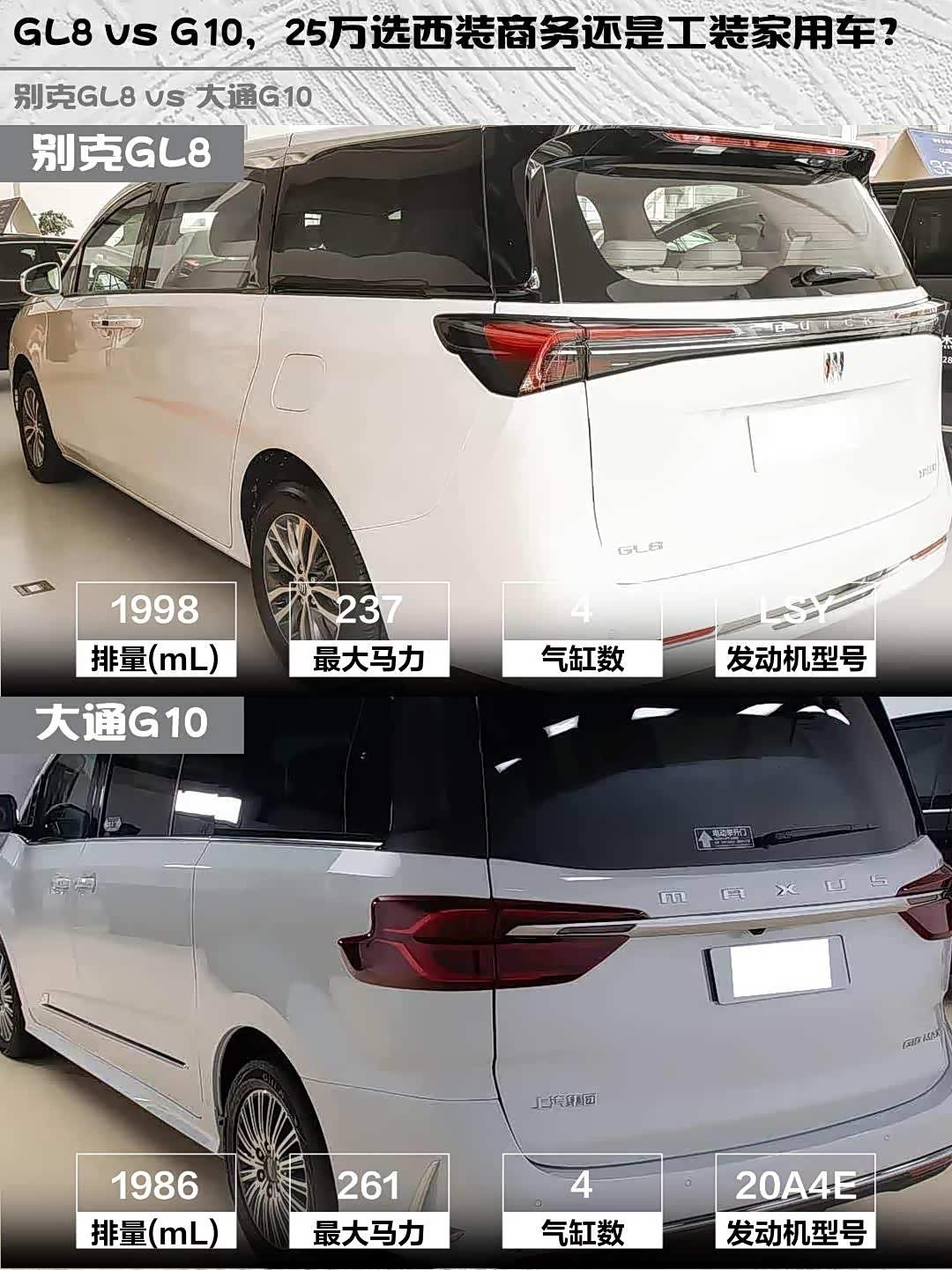 商务接待选GL8不会错,陆上公务舱的航空座椅+三层隔音玻璃接待客户有面子;家庭用户看G10更实惠,18.98万比GL8便宜1万,后驱布局拉重物更给力。不过GL8三年10万公里质保比G10的6万公里更厚道。