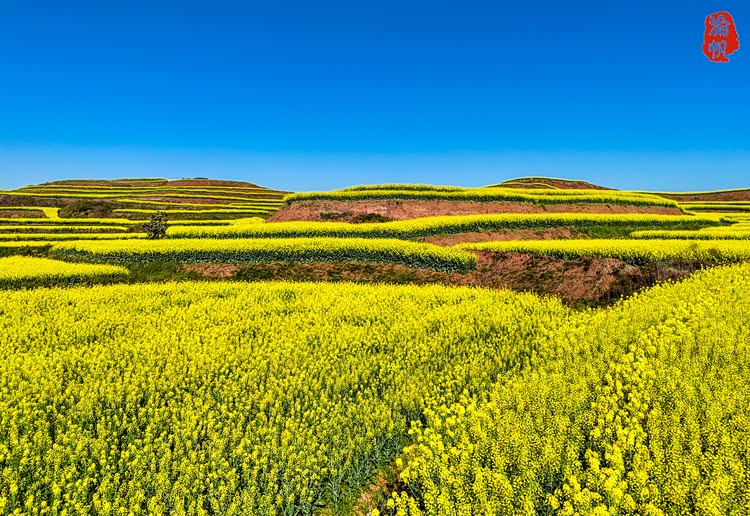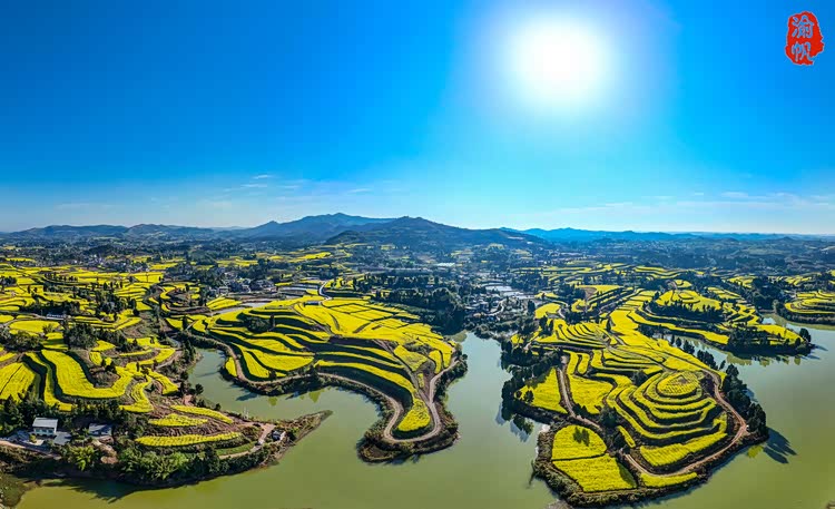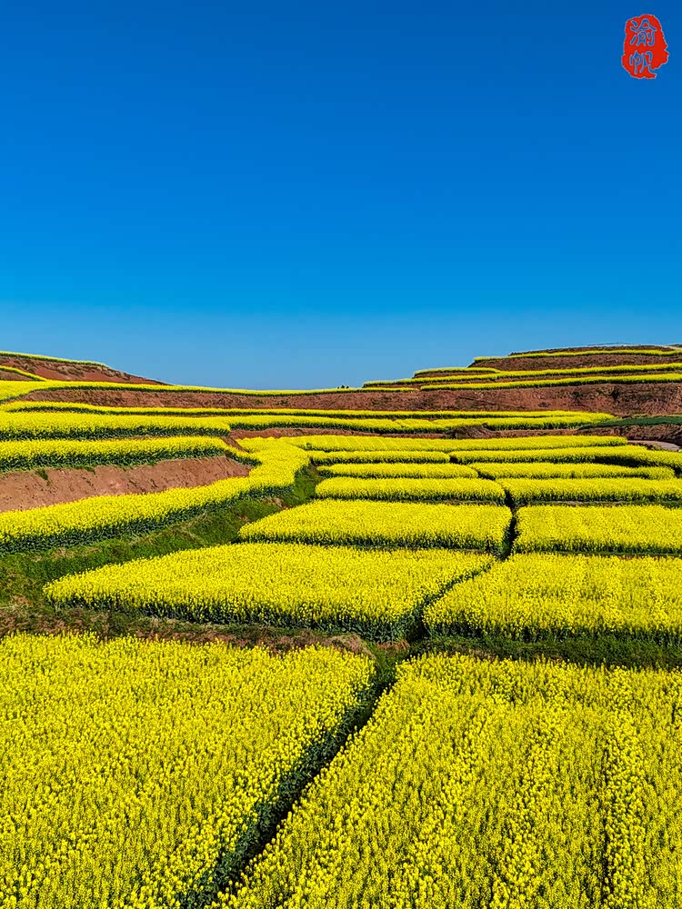 站在高处俯瞰,层层叠叠的梯田顺着山势蜿蜒,像大地铺展开的金色褶皱。每一块田埂都被油菜花填得满满当当,明黄的花瓣在阳光下泛着绒绒的光,从山脚一直铺到远处的黛色山巅。几汪碧绿的湖水嵌在花海之间,像被遗落的翡翠,将蓝天、白云与漫山的金黄都揉进了水里。风一吹,花浪便顺着梯田的纹路起伏,带着春日的暖意掠过脸颊,连远处的村落都被染成了温柔的模样,白墙黛瓦在花海中若隐若现,像极了陶渊明笔下的世外桃源。