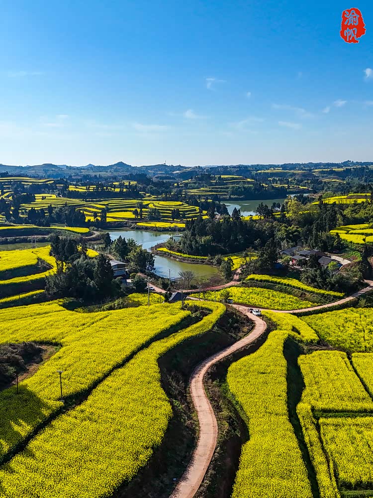 从重庆主城出发,沿着渝蓉高速一路向西,不过1.5小时的车程,便从钢筋水泥的都市,跌进了这片被春天偏爱的乡野。若是从潼南城区赶来,则只需20分钟,导航“丁坝村”即可,车子便能顺着平整的乡村公路,直接开到花海中央。没有景区的门禁,没有检票的队伍,推开车门的瞬间,漫山遍野的金黄便撞进眼里,连呼吸都带着油菜花的清甜香气。