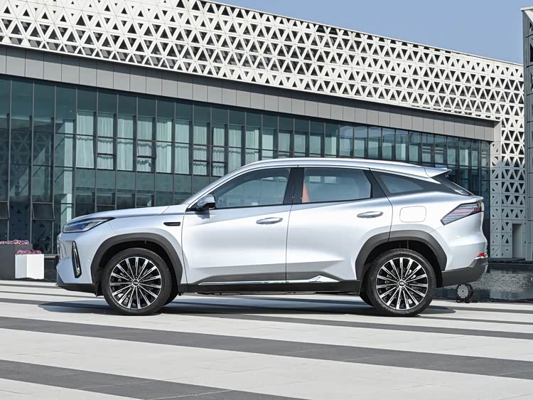 侧面造型方面,车顶带着明显的弧度,线条感显得比较圆润,而且配备有行李架;车顶还营造出了悬浮式造型,属于目前非常流行的设计语言;腰线前低后高,采用了贯穿式设计,点缀出了车身侧面的层次感,同时也增强了姿态感;轮眉和侧裙部分设计有粗壮的黑色饰板,带来了比较强的力量感;轮毂则是五辐式造型,风格比较简洁。
