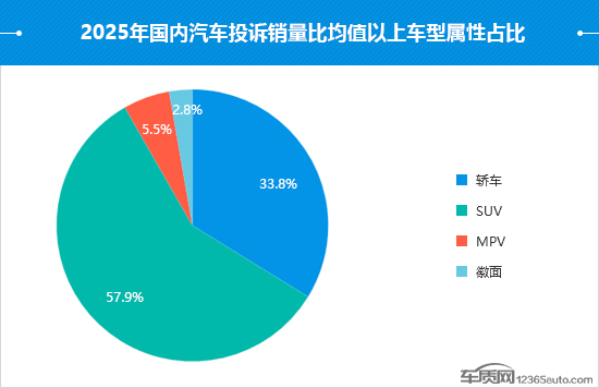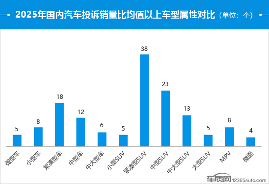 据国内领先的缺陷汽车产品信息收集平台车质网的统计数据显示,2025年国内汽车投诉销量比年度均值约为万分之58.4,较2024年的万分之45.1有明显提升,整体口碑出现转差迹象。据乘联会数据显示,2025年汽车累计销量23,878,615辆,其中有销量数据的车型共753款,由此得出国内汽车年销量平均值为31,711辆。据统计,2025年共有199款车型超过了汽车年销量平均值,包括轿车78款,SUV车型109款,MPV车型8款,微面4款。其中,共有145款车型因投诉销量比表现优于年度均值而入选榜单,具体排名如下:
