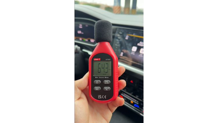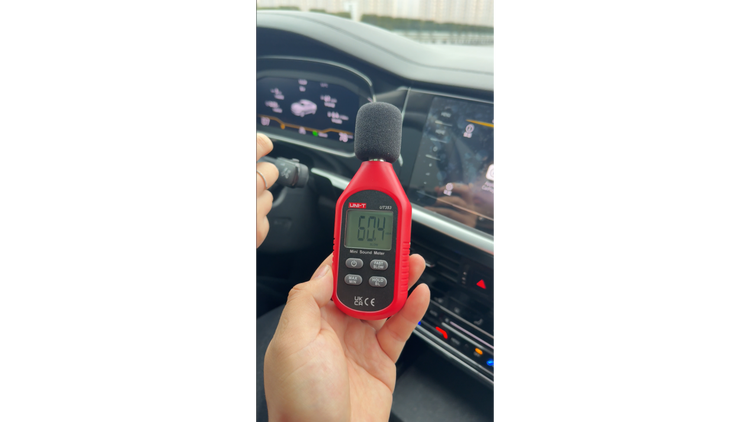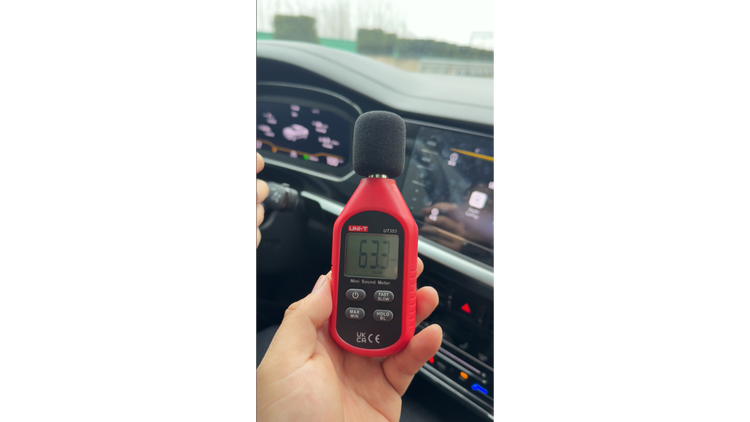 还是上仪器用数据说话,现在速度我们先降下来,现在时速是80,仪表显示大约60分贝。