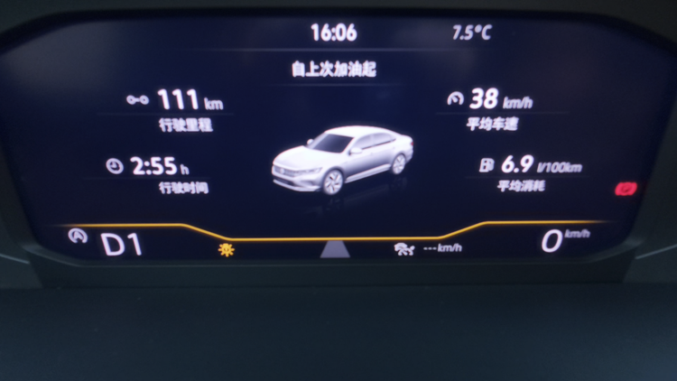 又到我们出发时的加油站了,看一下仪表数据,城区跑了31公里,显示的平均油耗是8.5L。然后总数据呢,是跑了111公里,用时2小时55分钟,全程平均油耗6.9L。现在我们再去把它加满油,看看表显油耗准不准。
