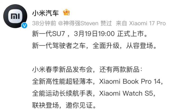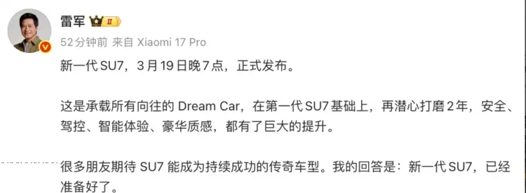 日前,我们从小米汽车官方公布的信息来看, 小米SU7(参数|询价)将在3月19日上市。根据此前公布的预售数据,新车预售区间为22.99-30.99万元。企业负责人雷军在公开沟通中提到,新款车型在研发阶段经历约两年的产品打磨周期,研发重点集中在安全结构、底盘控制、智能化系统以及车内材质等方向。从预售阶段释放的信息判断,新车在核心硬件和电子架构方面进行了系统升级,因此生产与供应成本有所变化,最终上市价格相比此前版本存在调整的可能。