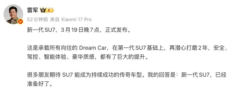 在谈及这款新车时,雷军表示,团队对新款SU7进行了为期两年的深入打磨,目标是使其在多个核心维度上实现显著进步。他特别提到了安全、驾驶操控、智能体验以及车辆所营造的豪华质感,并称在这些方面,新款车型带来了可感知的变化。对于外界期待SU7能成为一款经典车型的声音,雷军的回应显得颇具信心。