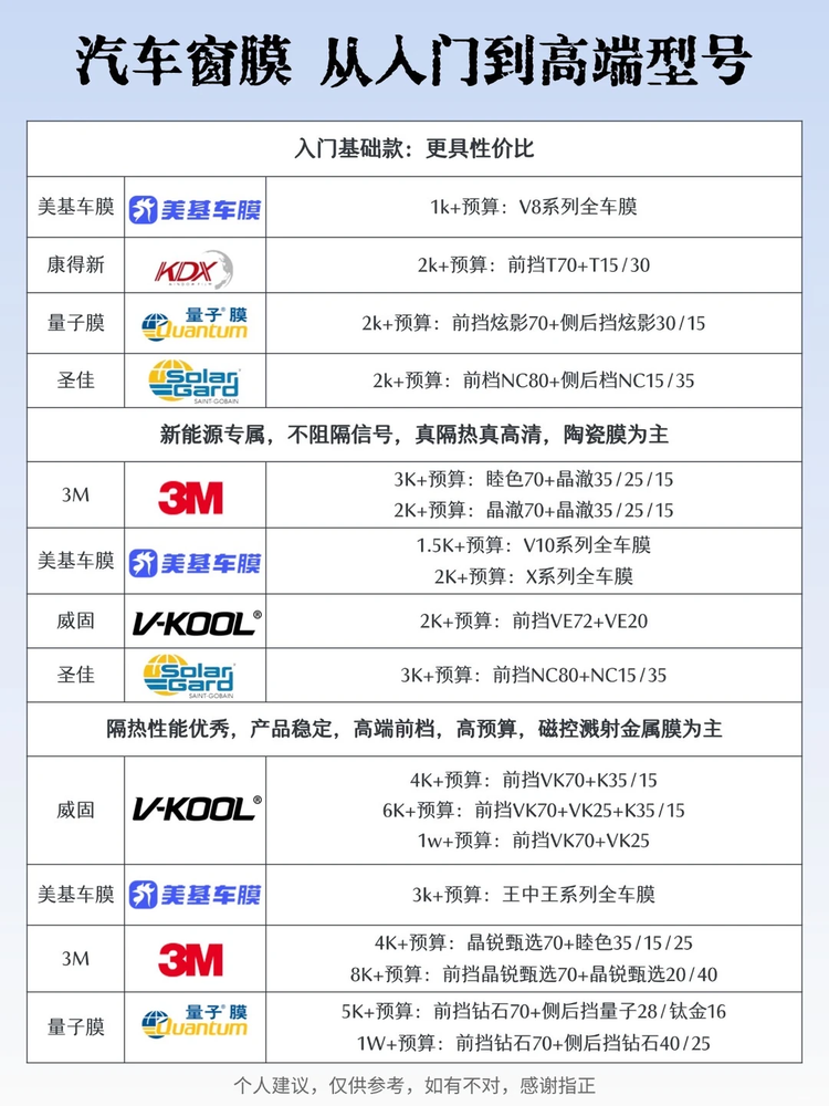 - 新能源款:适合电车车主,推荐3M晶澈、威固VE系列、美基V10/X系列等陶瓷膜。