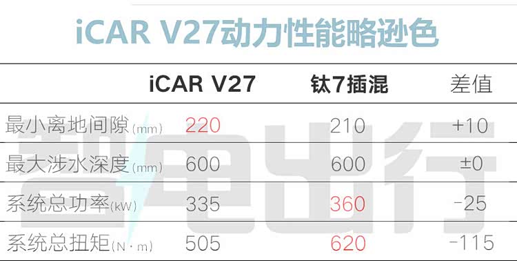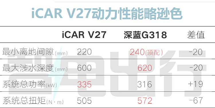 iCAR V27的指导价比方程豹钛7和深蓝G318都便宜,如果再算上限时优惠政策,其落地价要比这两款车低不少。不过也要看到,V27的动力性能和对手存在差距。