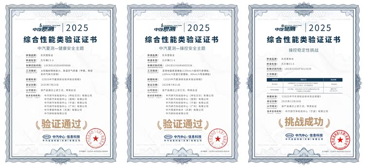 在2025中汽夏测中,凡尔赛C5 X以29%的超低整车太阳辐射透射比和高温VOC零超标的健康座舱,荣获“健康安全认证”。同时,在湿地高速爆胎三大工况——120km/h直线行驶爆胎、120km/h变道行驶爆胎、80km/h弯道爆胎中全部通关,斩获“操控安全认证”。