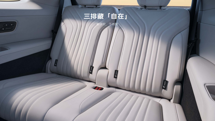 三排座椅的细节更值得说。很多六座车的第三排就是个“小板凳”,坐垫薄、靠背直、头顶压抑。银河M9的三排是全尺寸座椅,坐垫厚度和前排看齐,靠背能躺到150度,1米75的成年人坐进去腿部还有一拳空间。头顶开了0.15㎡的勃朗峰舷窗,面积是同级最大,第三排乘客不会觉得闷。两侧还有独立的杯架和手机槽,充电口也是独立配置,第三排被当人看了。