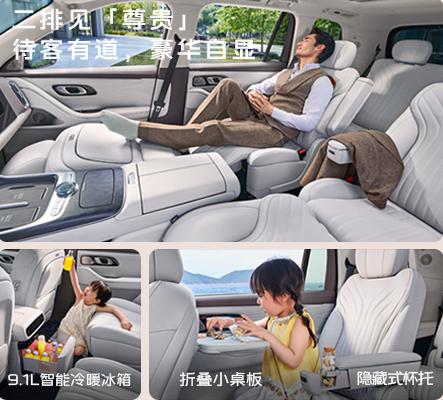 先说二排的9.1L智能冷暖冰箱。这个容积不算大,但刚好够用:放四瓶矿泉水,或者两罐奶粉,或者孩子的酸奶和水果。温度可调范围从-6℃到50℃,夏天冰饮料、冬天热牛奶都够用。冰箱放在中央扶手箱位置,前排二排都能伸手拿到,不用停车翻后备箱。停车断电后还能保温一段时间,去超市买菜回来还是凉的。