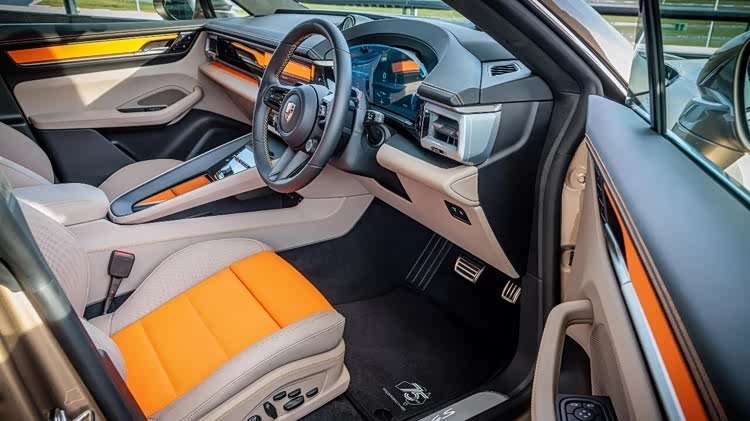 作为3月5日澳大利亚F1一部分,共有四辆专门定制的保时捷车型亮相。他们的灵感都来自澳大利亚的自然风光。纯电动Macan以蓝色和沙滩金色调,演绎澳大利亚海岸线的冲浪文化。这台Macan 4S采用金青铜金属漆(Paint to Sample),内饰细节灵感来自海岸地质和石灰岩地貌,这是对“南部”风景的低调致敬。