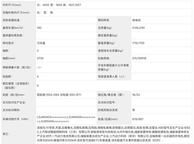 先看车身尺寸,长宽高为4500、1849、1621(1627)mm,轴距2735mm,考虑到测量误差,基本和MG ES5保持了一致。但仔细看前后轮距的申报,MG4X竟然有两组不同的数据,分别是1554/1561、1564/1571mm——不同轴距同时出现在一款车上,意味着大概率是两个平台。