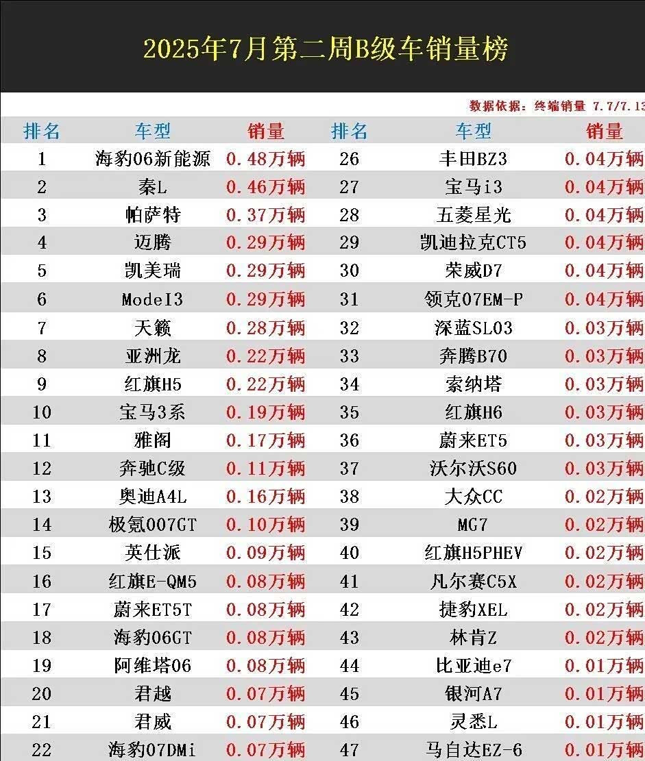 7月第二周的销量榜单让所有人大跌眼镜:长期霸榜的比亚迪秦L被自家兄弟海豹06反超后者以4800辆的成绩意外登顶。 曾经需要加价5万才能提车的帕萨特如今终端价直降6万却依然被甩开1000多辆的差距勉强守住第三名。