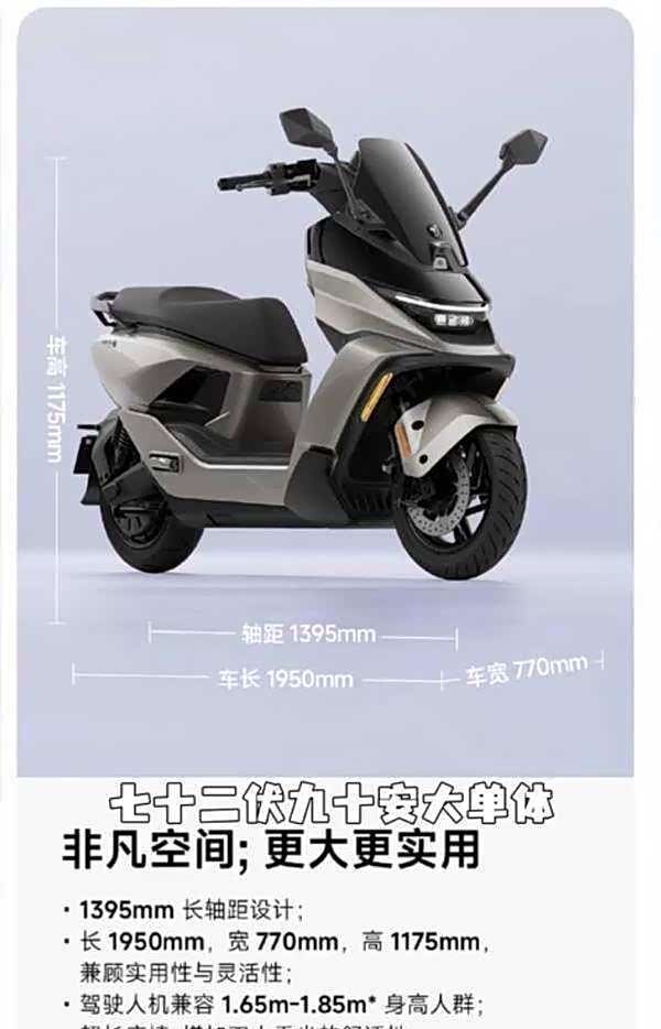 从车身数据来看,M5堪称九号家族的“巨无霸”。整车长1950mm、宽770mm、高1175mm,轴距达1395mm,不仅比九号此前的M3系列大上一截,甚至超过了E300P,成为品牌迄今最大的新车型。体型越级,意味着它拥有更强的承载力和功能性。