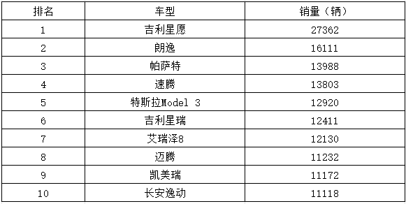 2月份, 轿车销量前十中,仅有冠军吉利星愿和第五名的特斯拉Model 3两款电动车入选。吉利星愿以27362辆的绝对优势夺冠,是本月唯一销量破2万的车型,成为新能源车在淡季的一根独苗。特斯拉Model 3则凭借12920辆的成绩,在燃油车的包围圈中撕开了一道口子。