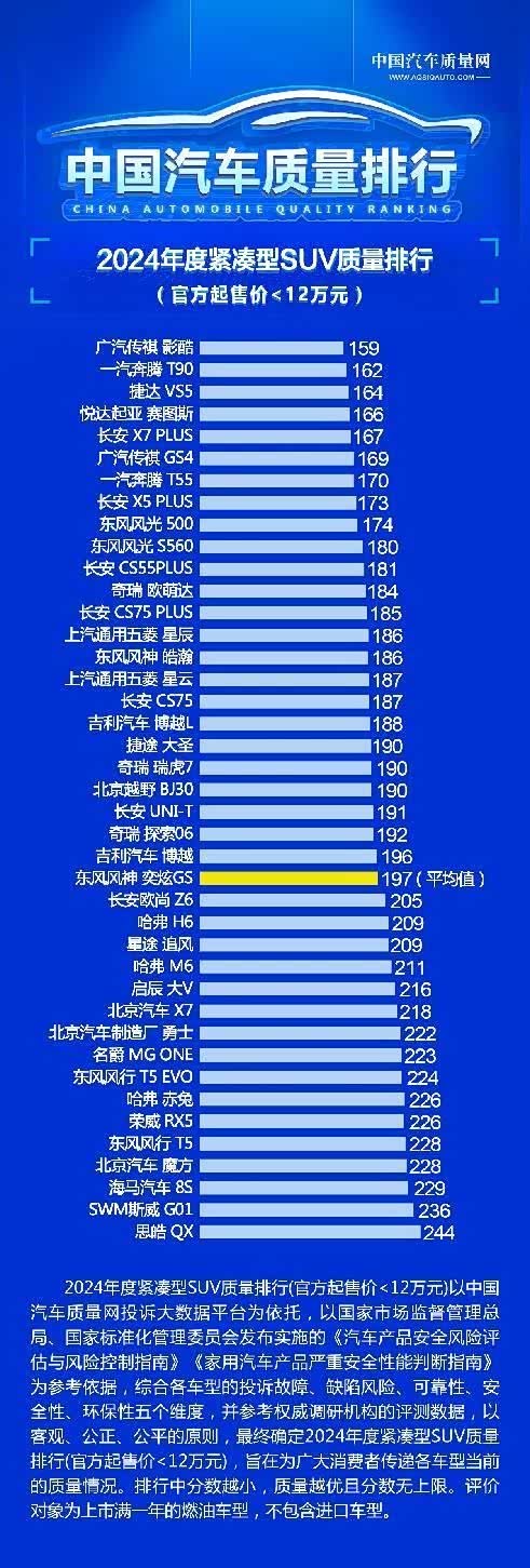根据中国汽车质量网上的信息显示,排行中分数越小,质量越优,平均值之上的车型主要为车身和电气设计方面的问题,包括车身部分锈蚀、座椅调节功能故障、车机卡顿、空调制冷效果差等问题。