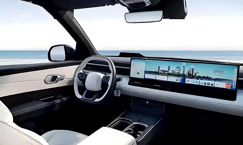 最吸引眼球的,就是中控台上一块长长的大屏幕,从方向盘后面一直延伸到副驾驶前面,足足有27英寸,看起来特别震撼,很有那些新势力造车的感觉。