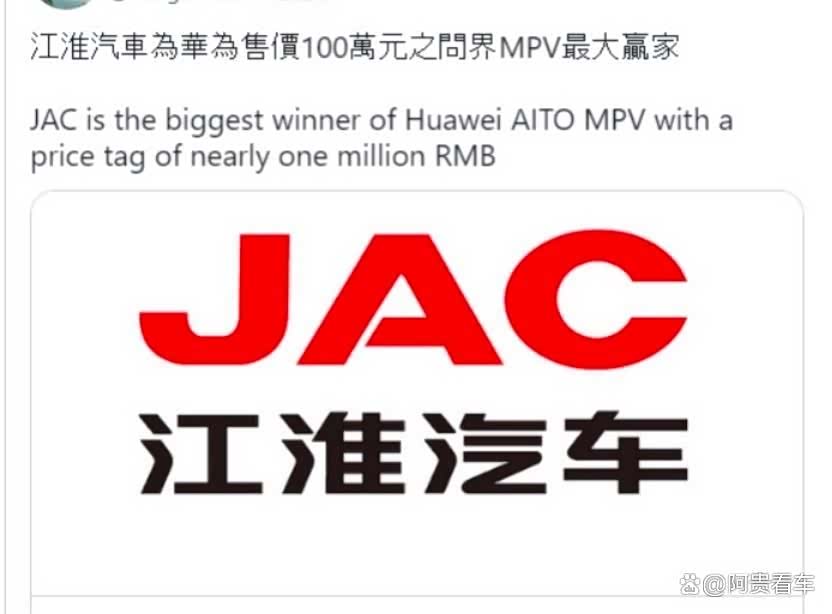 近日,有消息称,华为与江淮汽车正合作开发售价约100万元的MPV车型,预计在2024年二季度量产,销量目标为发售一年后达到约5万辆。虽然华为和江淮方面都没承认此事的真实性,但这消息让外界觉得可信度极高,毕竟华为与江淮的合作已经传了很久很久了。。