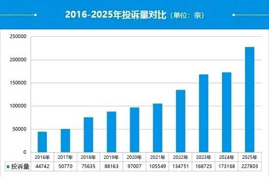 2025年,车质网受理的有效投诉高达227,803宗,同比增长31.6%,创历史新高。其中,自主品牌投诉占比持续提升,新能源汽车投诉占比升至44.8%,插电式混合动力汽车投诉量最高。车身附件及电器故障占比超六成,销售环节的定金纠纷、承诺不兑现、价格变动问题依旧突出,新旧款迭代纠纷成为新的核心矛盾点。