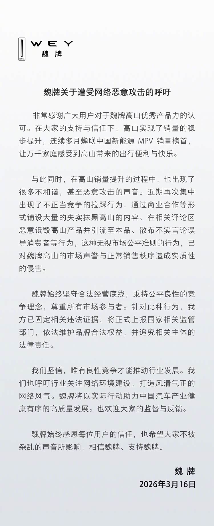 车家号·0浏览·2026-03-16 19:36 · 北京PChome 3月16日消息,长城魏牌于今日发布声明,称旗下高山MPV在销量提升过程中遭遇有组织的网络恶意攻击。