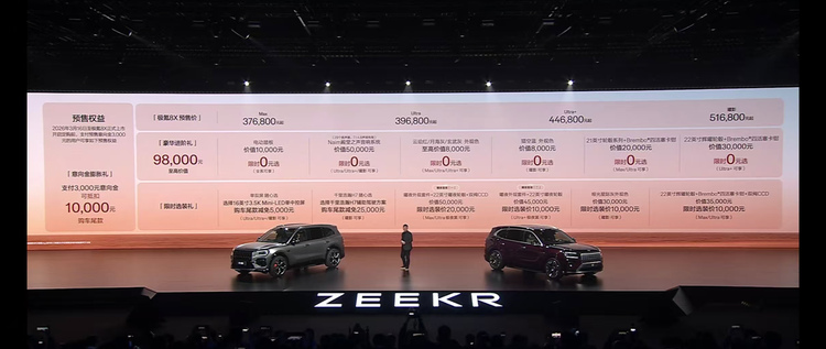 3月16日, 极氪8X(参数|询价)举办技术发布会并正式开启预售,共推出四款车型,Max版预售价37.68万元、Ultra版39.68万元、Ultra+版44.68万元、曜影版51.68万元。