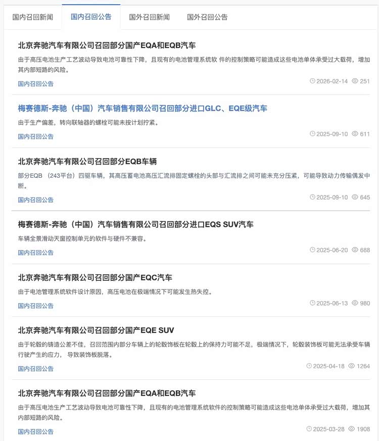 电车通从「中国汽车召回网」查询到,奔驰EQ系列是召回的常客,今年2月份就因为高压电池生产工艺问题,导致部分车辆存在起火风险,共召回19481辆奔驰EQA和奔驰EQB。